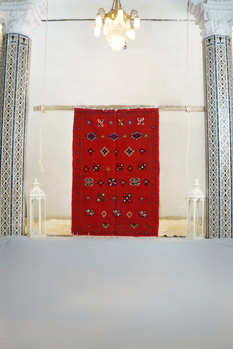 A powerful and vibrant Moroccan Akhnif flat-weave. The rug features a saturated, deep red field that serves as a dramatic canvas for the scattered arrangement of traditional Amazigh symbols in deep blues, greens, white, and black. Handwoven in wool, this textile offers strong visual impact and rich cultural depth.