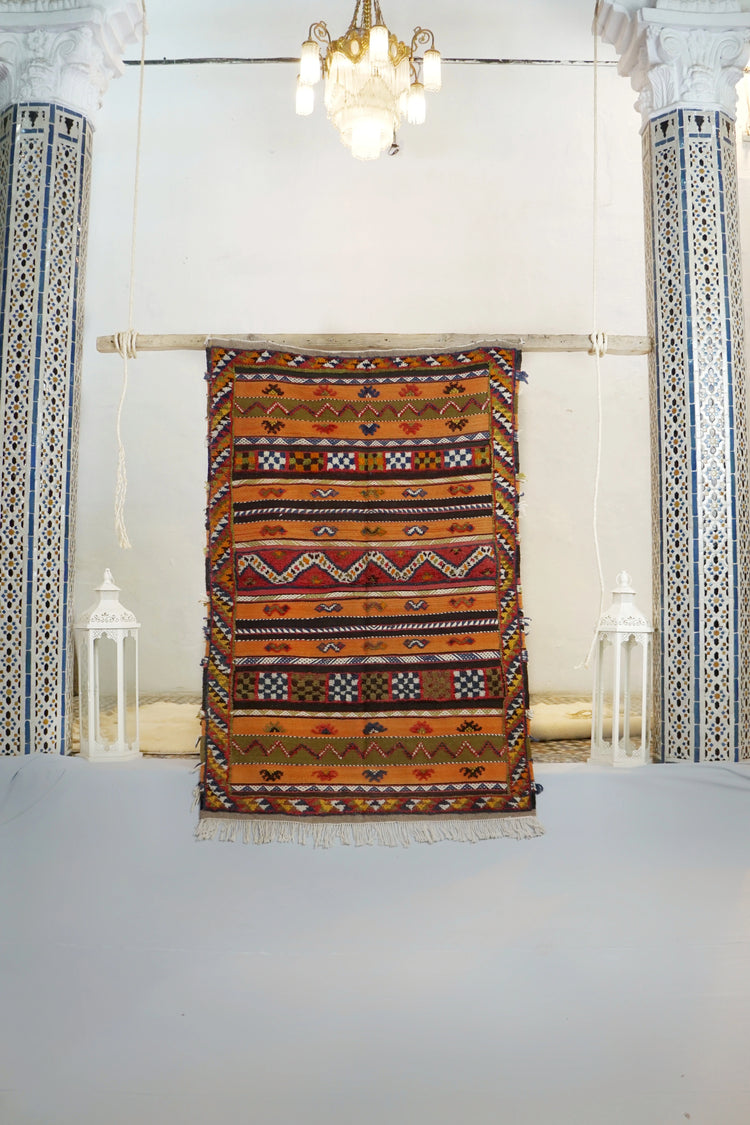 Bring the warmth of Morocco into your home with this stunning Glaoui rug. This authentic Berber textile is celebrated for its unique three-technique weave, expertly combining plush hand-knotting, durable flat-weaving (Kilim), and artistic embroidery into a single, textural piece.